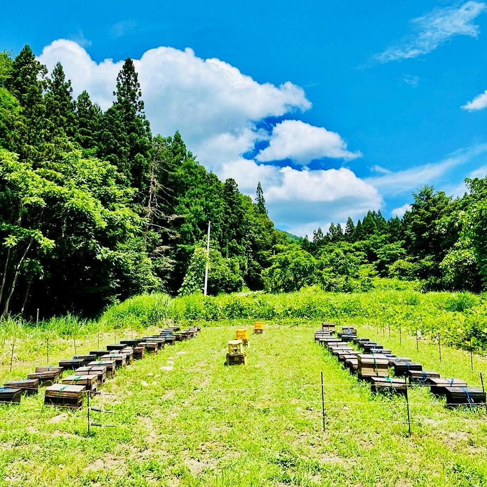 山形の豊かな山間に置かれた巣箱。 -